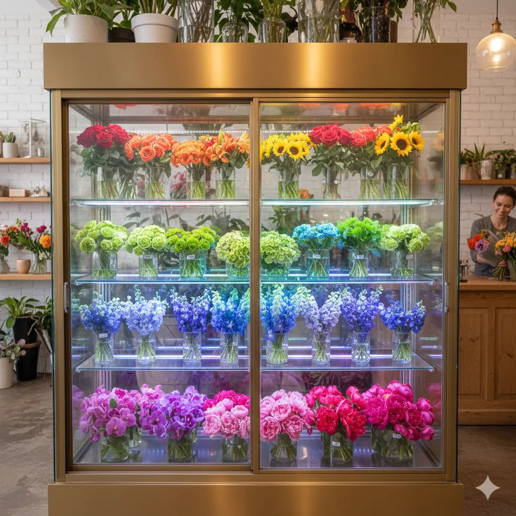 신선도 유지의 핵심: 꽃은 온도와 습도에 매우 민감합니다. 전문적인 꽃 쇼케이스는 일반 냉장고와 달리 미세한 온도 조절과 습도 유지가 가능하여 꽃의 수명을 연장시킵니다.