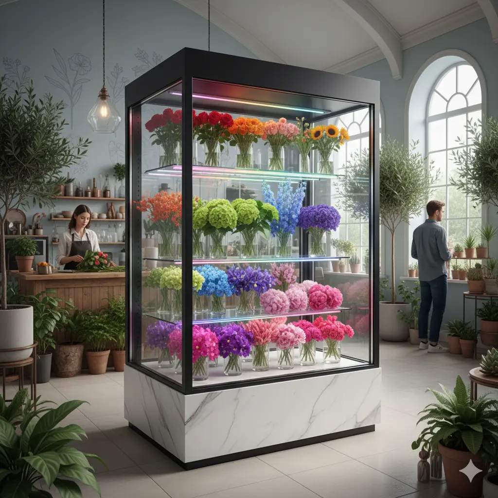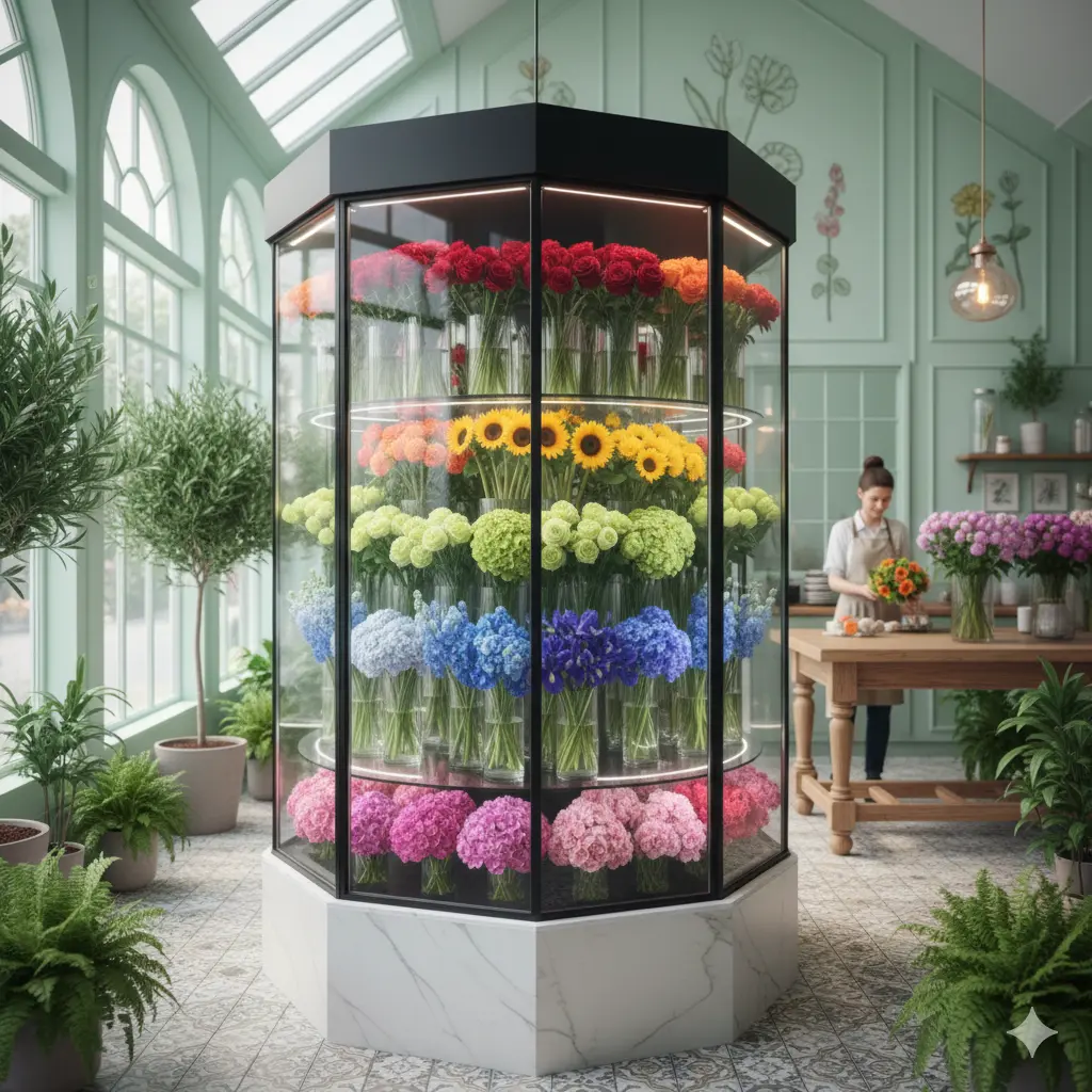 재고 관리의 효율성: 투명한 쇼케이스는 현재 보유 중인 꽃의 종류와 양을 한눈에 파악하게 해주어, 고객에게는 신뢰를 주고 운영자에게는 체계적인 재고 관리를 가능하게 합니다.