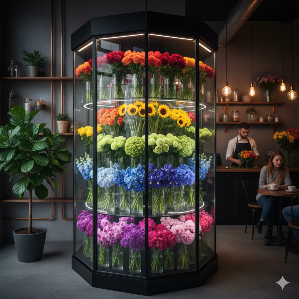 시각적 집중 장치: 쇼케이스 내부의 조명과 배치는 고객의 시선을 단번에 사로잡습니다. 꽃집 인테리어 전체 분위기에 맞춰 프레임의 색상(실버, 블랙, 화이트)과 유리 형태(직각, 라운드)를 선택해야 합니다.