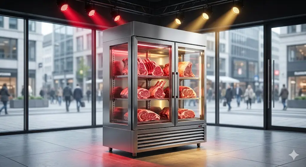 시내 한복판, 쏟아지는 인파의 시선을 단번에 낚아챌 소고기 디스플레이 비결! 단순 보관을 넘어 신선함을 전시하는 최첨단 고기냉장고 기술이 사장님의 객단가를 바꿉니다.