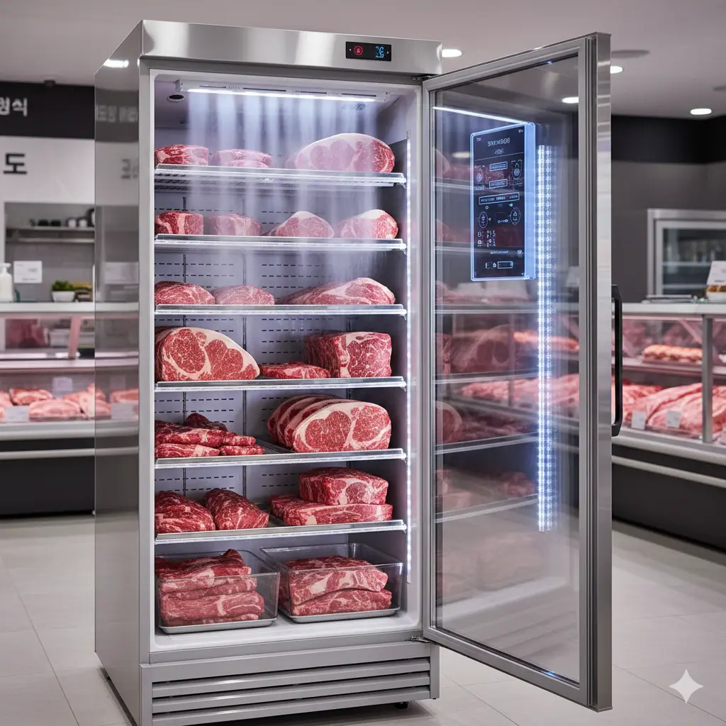 다음 단계로는 사장님 매장의 원육 수급 주기와 하루 판매량 데이터에 맞춰, 냉각 기류의 방향을 어떻게 세팅해야 가장 신선한 '웻 에이징(Wet Aging)' 효과를 얻을 수 있을지 조언해 드리고 싶습니다.