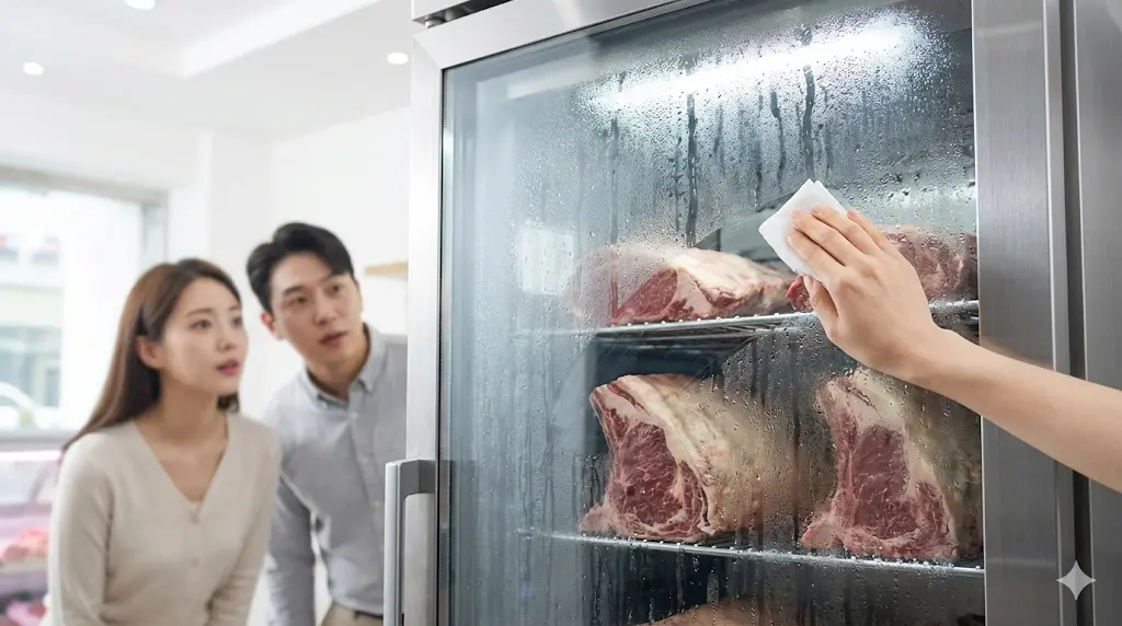 어떤 습한 장마철에도 유리창은 마치 없는 것처럼 투명함을 유지하여, 사장님이 공들여 숙성하는 원육의 웅장한 자태를 고객에게 24시간 선명하게 전시합니다.