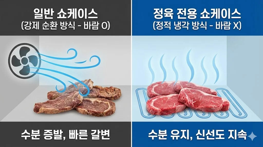 일반 쇼케이스 vs 정육 쇼케이스: 일반 음료용 쇼케이스나 저가형 제품은 냉각 팬(Fan)이 강하게 돌아가는 '강제 순환 방식'을 주로 씁니다.