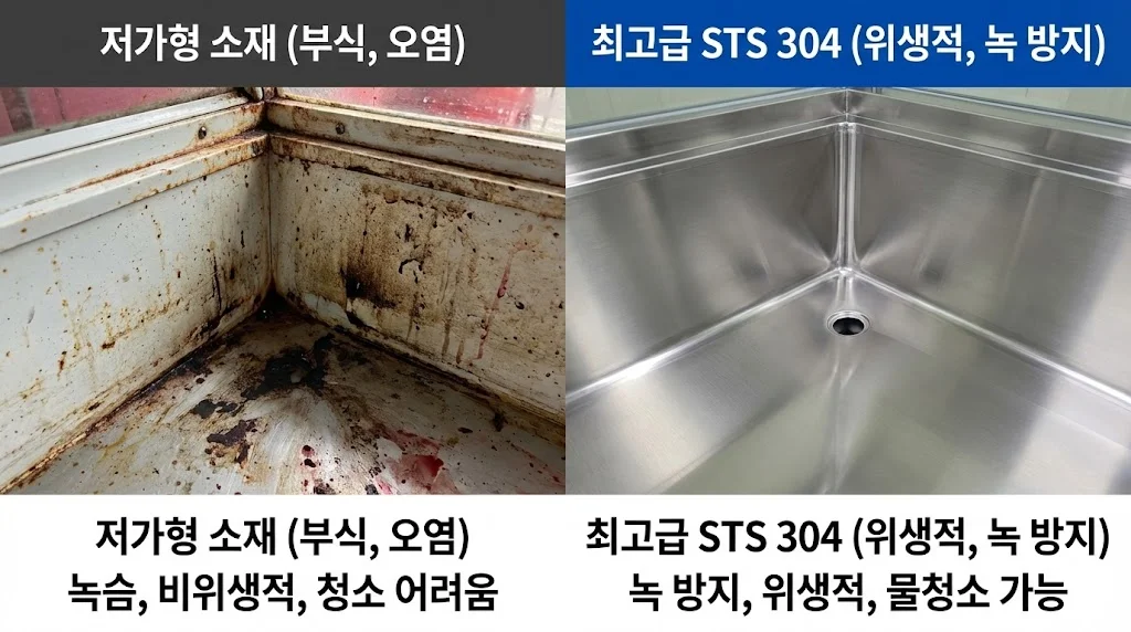 저가형 제품은 플라스틱이나 코팅 철판을 쓰는데, 코팅이 벗겨지면 바로 녹이 슬어 위생상 치명적입니다.