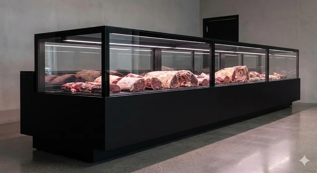 고기 쇼케이스는 크게 세 가지 형태로 나뉩니다. 첫 번째는 대면형(정육점형)입니다. 사장님이 직접 고기를 썰어 진열하고 고객과 소통하며 판매하는 방식에 적합합니다. 시야 차단이 적고 고기가 가장 먹음직스럽게 보이는 각도로 설계됩니다.