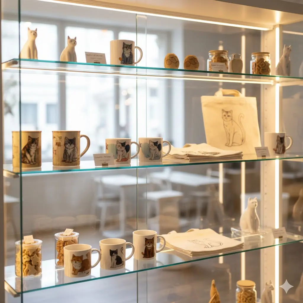 굿즈 레이어드 진열: 자체 제작한 고양이 캐릭터 그립톡, 에코백 등을 쇼케이스 내부에 입체적인 높낮이를 주어 전시하세요.