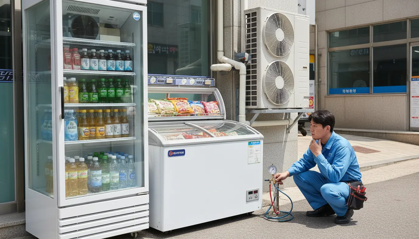 하지만 가성비 위주의 기성품 브랜드들은 가정용에 준하는 소형 콤프레셔를 사용하는 경우가 많습니다.문을 자주 여닫지 않는 가정집 환경이라면 문제가 없겠지만, 하루에도 수십 번씩 문을 여닫는 매장 환경에서는 콤프레셔가 과부하에 걸리기 십상입니다.