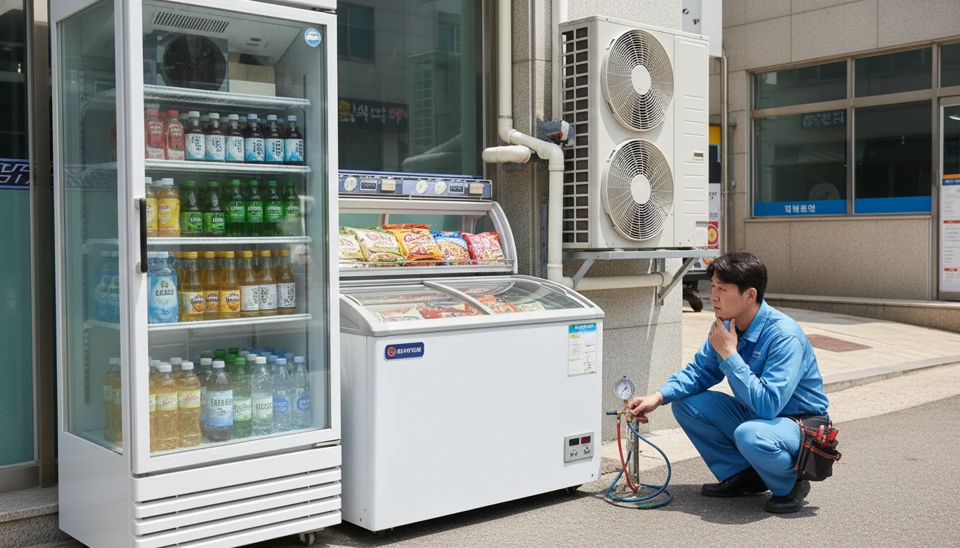 외부와 내부의 온도 차이가 심한 여름철 장마 기간에도 유리 표면에 물방울이 맺히지 않아, 고객은 유리 없이 과일을 직접 보는듯한 투명함을 느낄 수 있습니다. 시각적 장애물을 없애고 과일 본연의 색감을 극대화하는 것, 이것이 매출과 직결되는 디테일입니다.Q3. "여름만 되면 냉장고 소리가 너무 크고 온도가 잘 안 떨어져서 불안해요. AS를 불러도 그때뿐이고요."