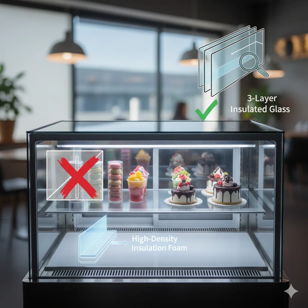 아무리 강력한 콤프레셔를 사용하더라도, 냉기가 외부로 새어나가면 전기 요금만 폭증하고 제품 신선도는 떨어집니다. 냉동 쇼케이스는 일반 냉장 모델보다 훨씬 두꺼운 단열 구조를 가집니다.