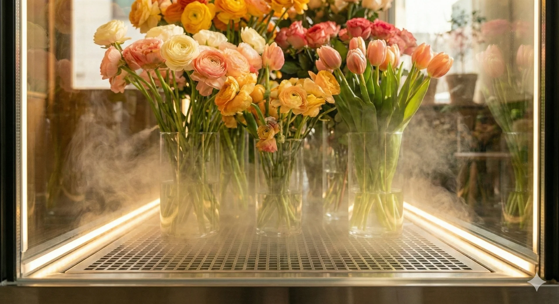 그런데 꽃은 온도와 습도에 정말 예민한 생물이에요. 일반적인 실온 환경의 진열대는 꽃의 호흡을 빠르게 만들어 금방 피게 하고, 결국 금방 지게 만들어요. 우리에게 필요한 건 단순한 선반의 기능을 하면서도 차가운 냉기를 머금은 전문 장비예요.