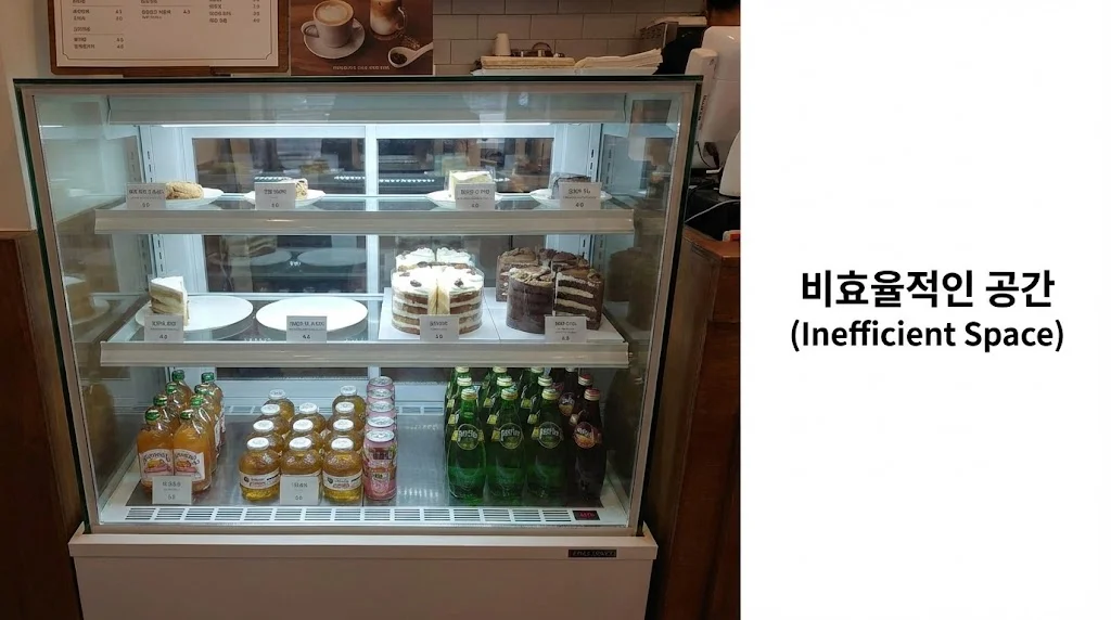 진열의 비효율: 판매하려는 제품(예: 높은 홀케이크 vs 낮은 마카롱)의 높이와 쇼케이스 선반 간격이 맞지 않아 진열이 어색해집니다.