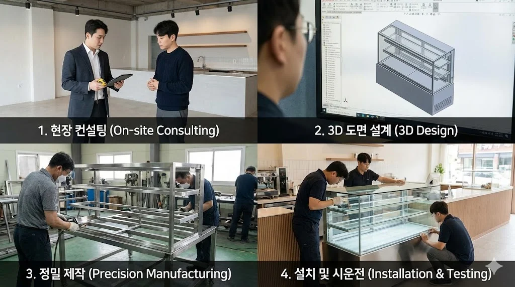 정밀 제작: 확정된 도면에 따라 공장에서 숙련된 장인들이 쇼케이스를 제작합니다. 이 과정에서 특수 조명, 습도 조절 장치 등 업종별 옵션이 적용됩니다.