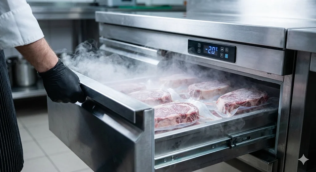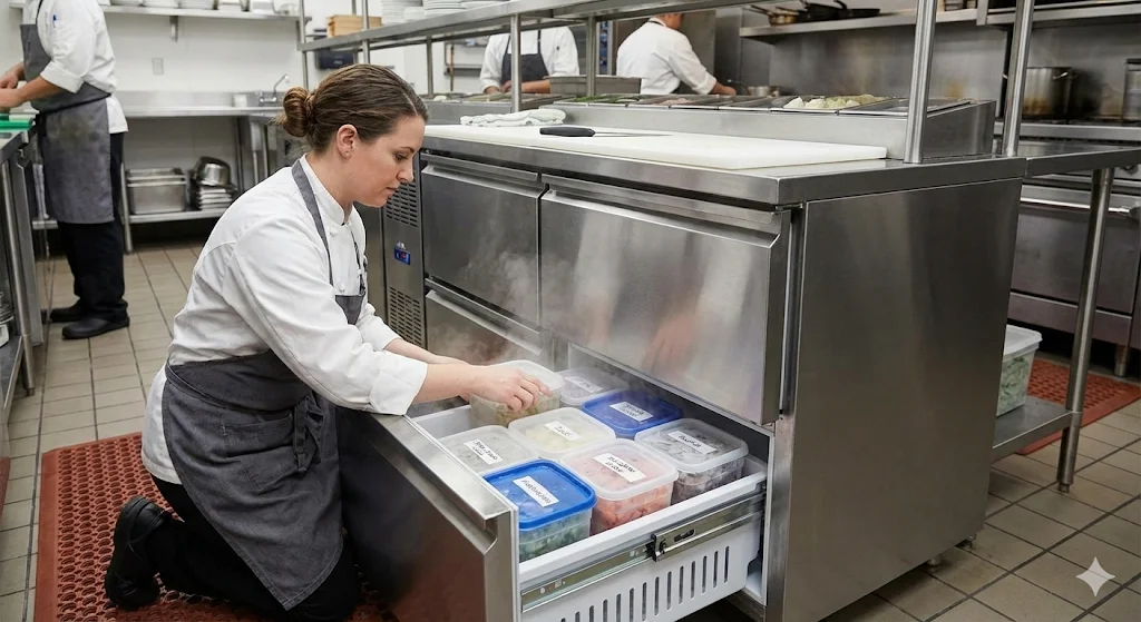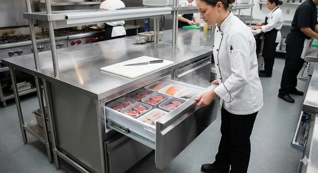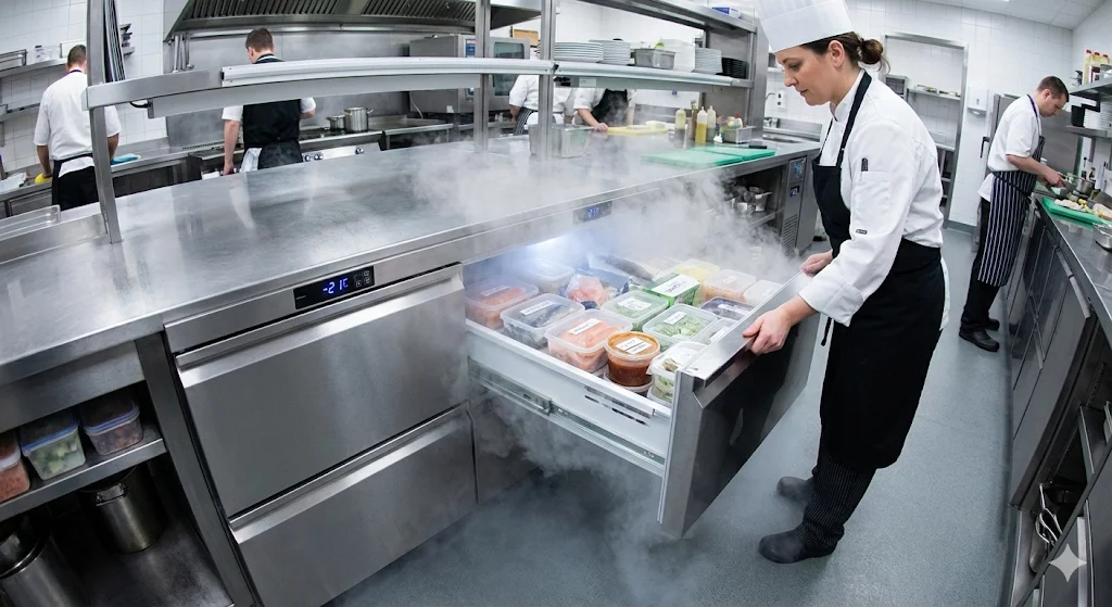 또한, 조리대 바로 아래에 서랍형 냉동고를 배치하면 조리사가 제자리에서 필요한 냉동 식품을 즉시 꺼낼 수 있어 동선 낭비가 거의 없습니다.