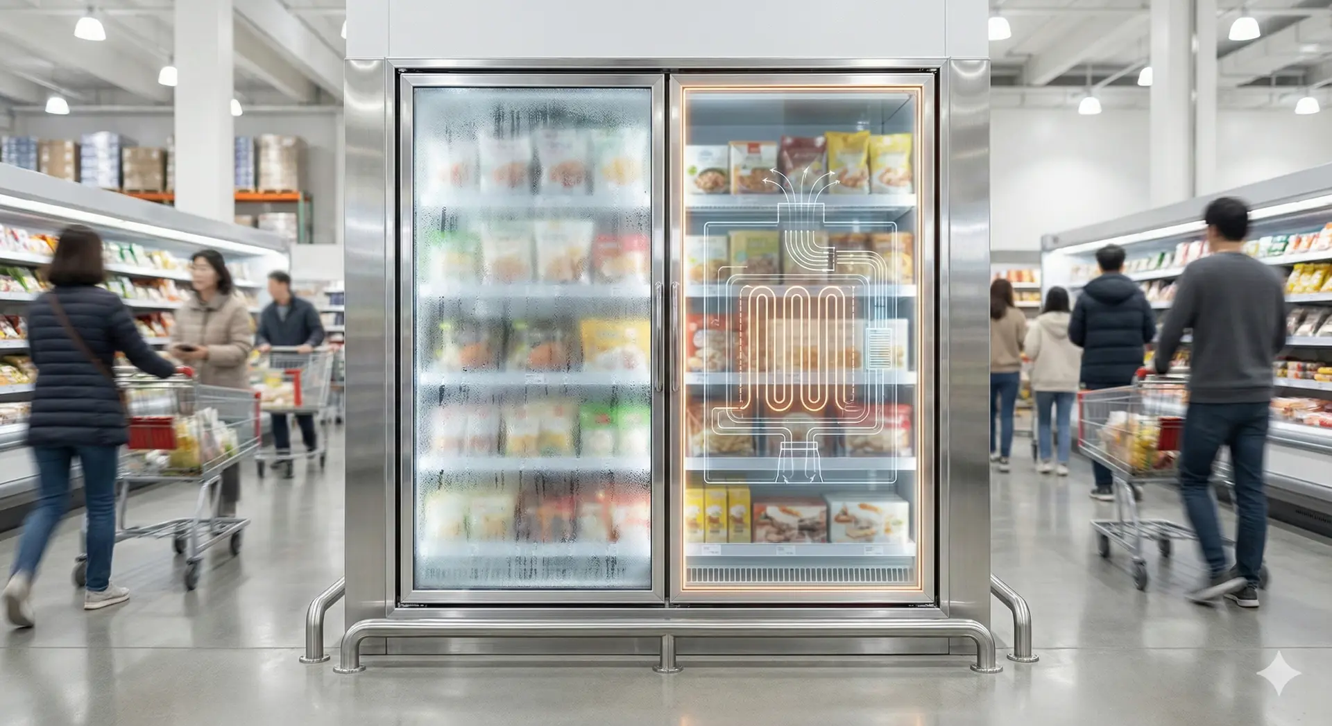 질문 2. 손님이 많을수록 유리에 습기가 차서 제품이 안 보여요, 냉동쇼케이스 의 선명한 시야를 유지하는 공학적 해법은?