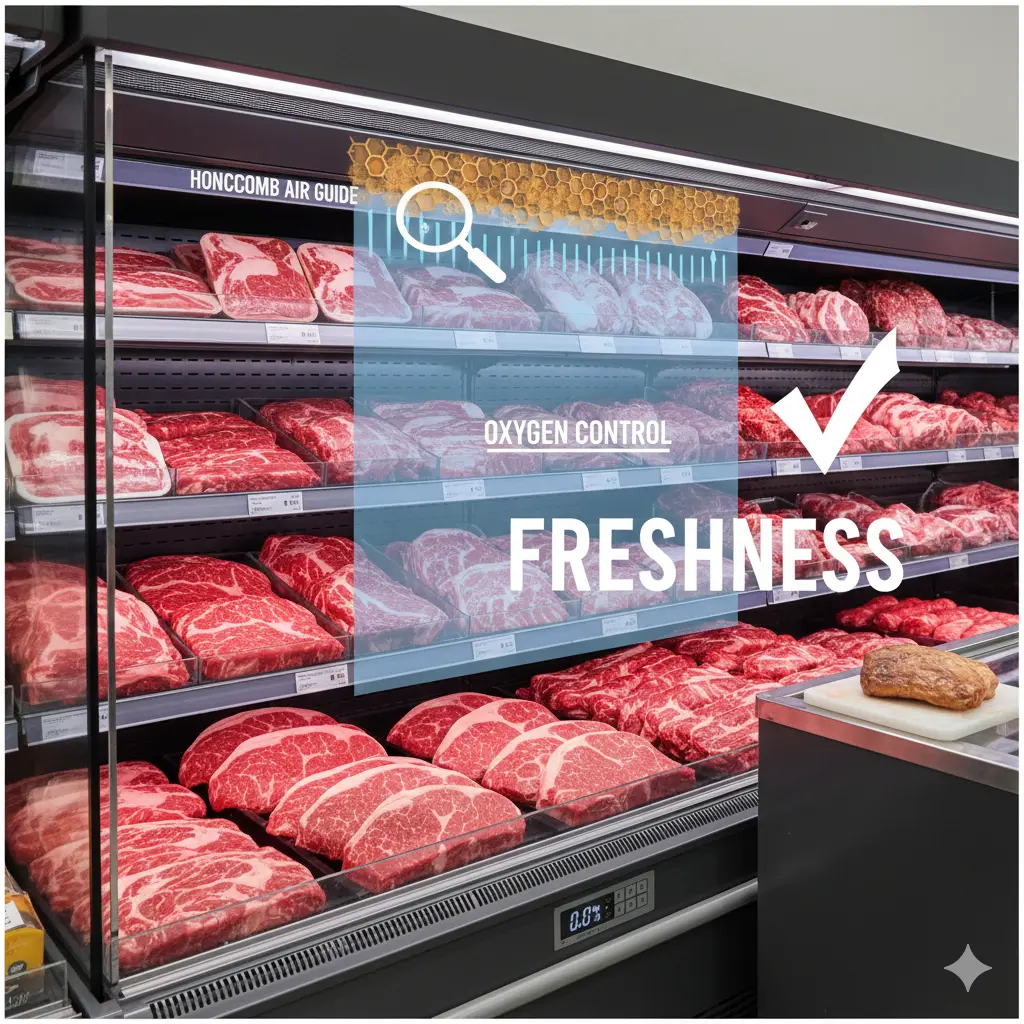 Q2. 냉장평대쇼케이스 속 고기색이 변하지 않는 이유, '허니컴 에어 가이드'와 산소 접촉 제어 기술의 상관관계는?