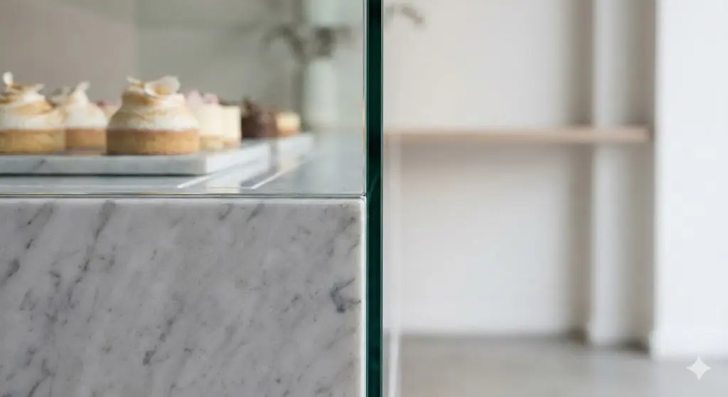 하이엔드 브랜드의 제로-핏 매립 시공은 카운터와 쇼케이스를 평면으로 일치시켜 공간이 끝까지 이어지는 듯한 개방감을 선사합니다.