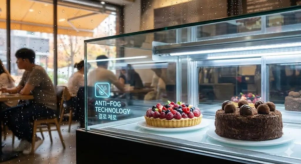 여름철이나 매장 내 습도가 높을 때 쇼케이스 유리에 맺히는 물방울은 상품의 가치를 떨어뜨리는 치명적인 요소입니다.
