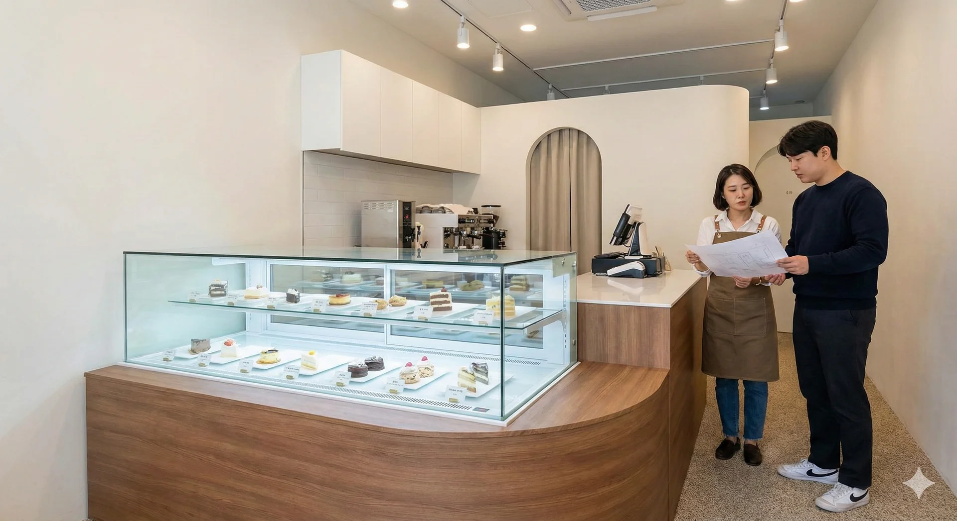 공간이 좁은 개인 카페라면 동선 효율이 무엇보다 중요합니다. 주방에서 제품을 넣고 손님이 앞에서 고르는 방식인지, 아니면 셀프 서비스가 필요한지에 따라 문의 위치와 열림 방식이 달라져야 하죠.