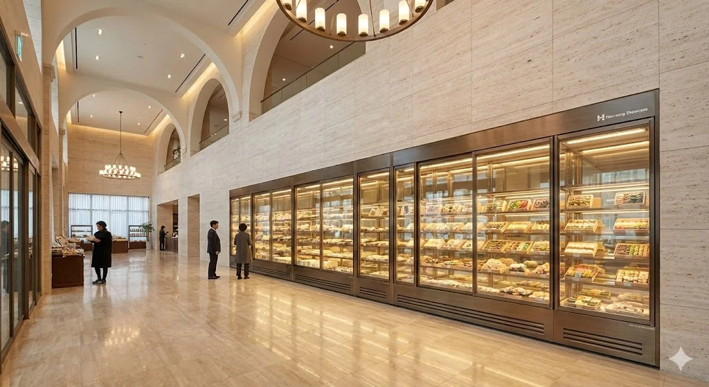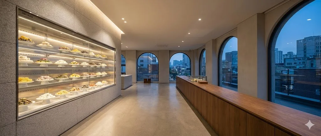 특징: 매장의 1mm 공간까지 활용하는 제로-핏(Zero-Fit) 시공으로, 쇼케이스가 벽면이나 카운터의 일부처럼 보이는 압도적 웅장함을 선사합니다.