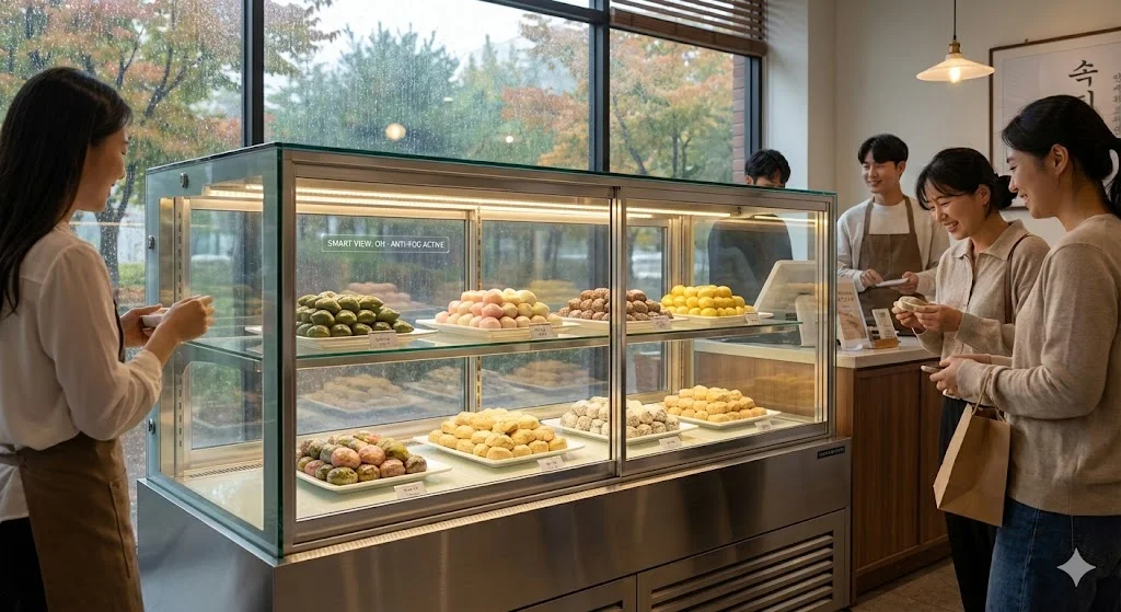 프리미엄 떡 카페와 하이엔드 답례품 매장에서 가장 중요한 것은 떡의 말랑한 식감을 유지하는 '수분 보존'과, 그 정갈함을 예술로 승화시키는 '전시 효과'입니다.