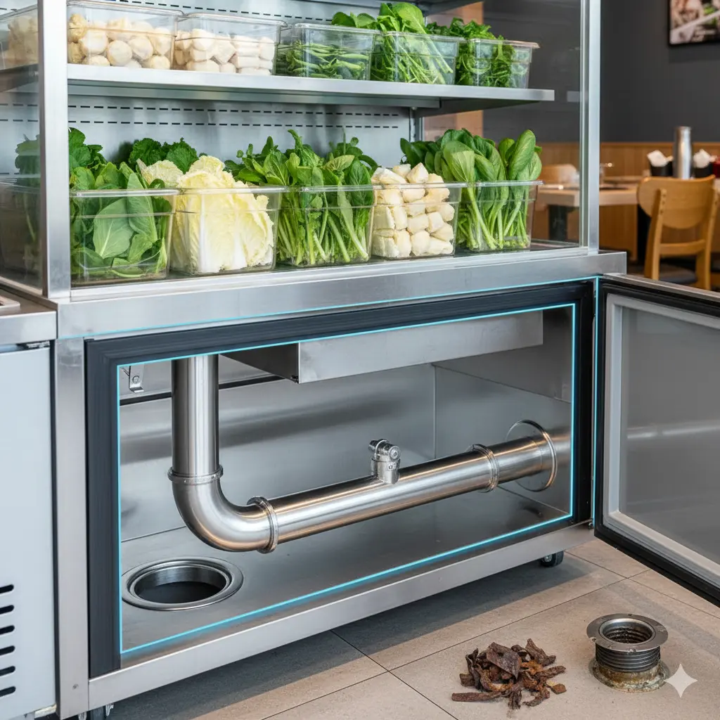 Q2. 마라탕쇼케이스 하부 배수구 막힘과 부식, 왜 스테인리스 304와 항균 가스켓이 필수일까?