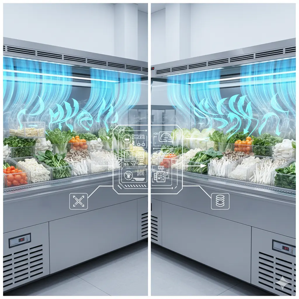 기술적으로 완성된 장비는 팬 모터의 RPM을 정밀하게 제어하여, 냉기가 식재료 표면을 부드럽게 감싸듯 흐르는 '라미나 플로우(Layered Flow)'를 형성합니다.