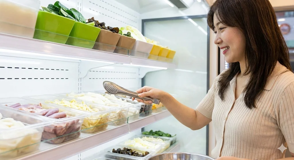 이는 좁은 공간에서도 답답함을 주지 않으면서 고객이 재료를 한눈에 파악할 수 있게 돕습니다.