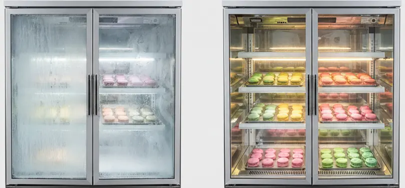 마카롱쇼케이스 내부의 온도가 들쭉날쑥하면 꼬끄 표면에 미세한 이슬이 맺히게 되고, 이는 곧바로 수분을 흡수해 식감을 망가뜨립니다.