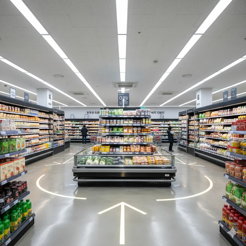 사장님, 마트 인테리어의 핵심은 고객이 매장에 머무는 시간을 늘리는 것입니다. 벽면 진열대만으로는 고객의 시선을 중앙으로 끌어오기 어렵습니다.