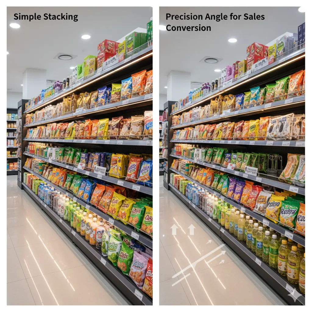 상품이 고객의 시선과 만나는 '골든 존'의 각도를 무시한 배치는 제품의 매력을 반감시키고, 손님의 시선이 머무는 시간을 단축시키는 결과를 낳습니다.