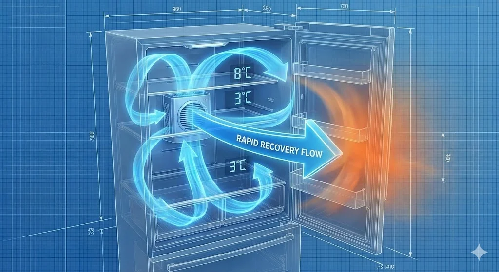 이는 문이 열리는 순간을 감지하여 냉기 손실을 막는 에어 커튼을 강화하고, 문이 닫히면 즉시 강력한 냉기를 뿜어내어 내부 온도를 순식간에 안정화시키는 기술입니다.