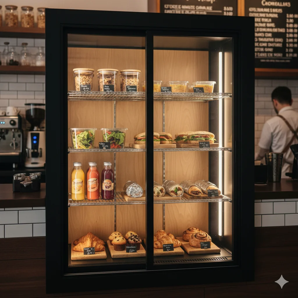 1-1. 모던하고 세련된 '사각 케이스쇼케이스' 최근 카페 트렌드는 단연 '사각'입니다. 군더더기 없이 딱 떨어지는 직선 라인은 모던하고 고급스러운 분위기를 연출합니다.