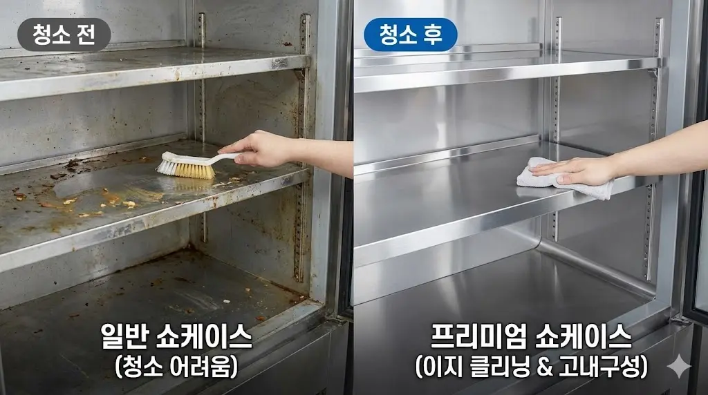 반찬은 드레싱이나 양념이 흐르기 쉽습니다. 청소가 힘든 구조의 업소용 쇼케이스는 결국 세균 번식의 온상이 되고 매장 전체의 위생 점수를 깎아먹게 됩니다.