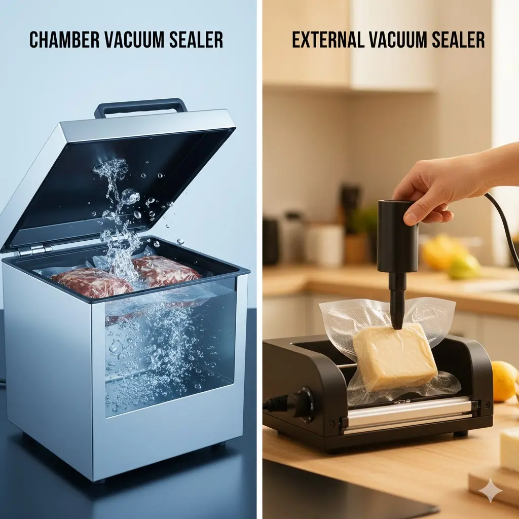 • 작동 원리: 뚜껑이 있는 공간(챔버) 안에 봉투를 넣고 전체 압력을 낮추는 방식입니다.