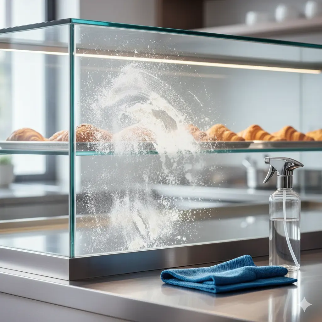 저가형 진열장에 쓰이는 저렴한 강화유리는 정전기를 과도하게 유도하여 매장 내 떠다니는 밀가루 가루와 미세먼지를 자석처럼 끌어당기는 ‘먼지 흡착’ 현상을 일으킵니다.