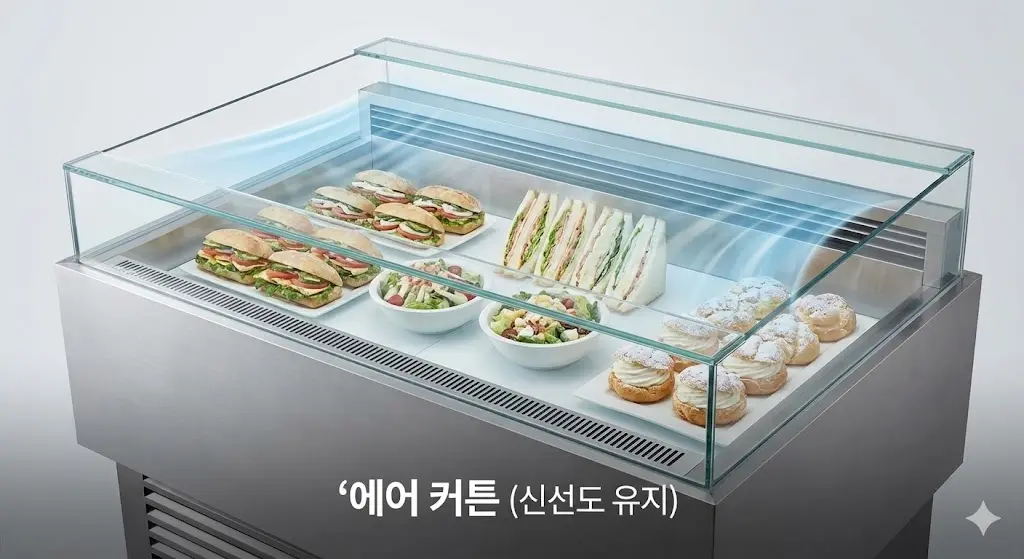 상단에서 차가운 에어 커튼(Air Curtain)을 형성하여 외부의 따뜻한 공기를 차단하고 내부의 냉기를 가두는 방식을 사용해요.
