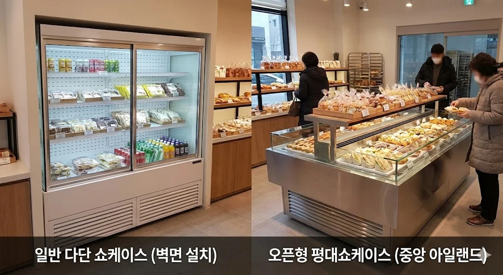 다단 쇼케이스는 벽면에 설치되어 층별로 제품을 보여주지만, 평대쇼케이스는 매장 중앙에 아일랜드 형태로 배치할 수 있다는 장점이 있지요.