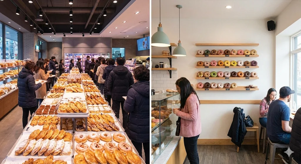• 디저트/특화 브랜드: 최근 급성장 중인 모델로, 식빵 전문점이나 도넛, 케이크 전문점 등이 해당합니다. 10평 내외의 소규모 매장에서도 운영이 가능하여 초기 비용을 1억 원 미만으로 낮출 수 있다는 장점이 있습니다.