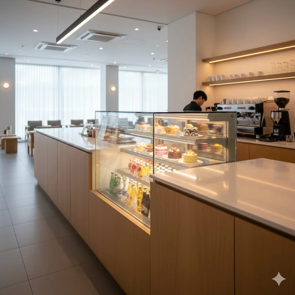 한성쇼케이스의 비스포크 진열냉장고가 설치되어 공간 효율을 극대화한 카페 카운터 전경