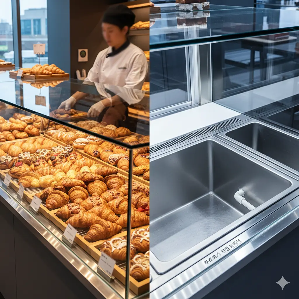 질문 3. 쏟아지는 주문 속에서도 위생을 지키는 빵쇼케이스 하부 배수판과 부스러기 전용 트레이의 기술적 편의성은?
