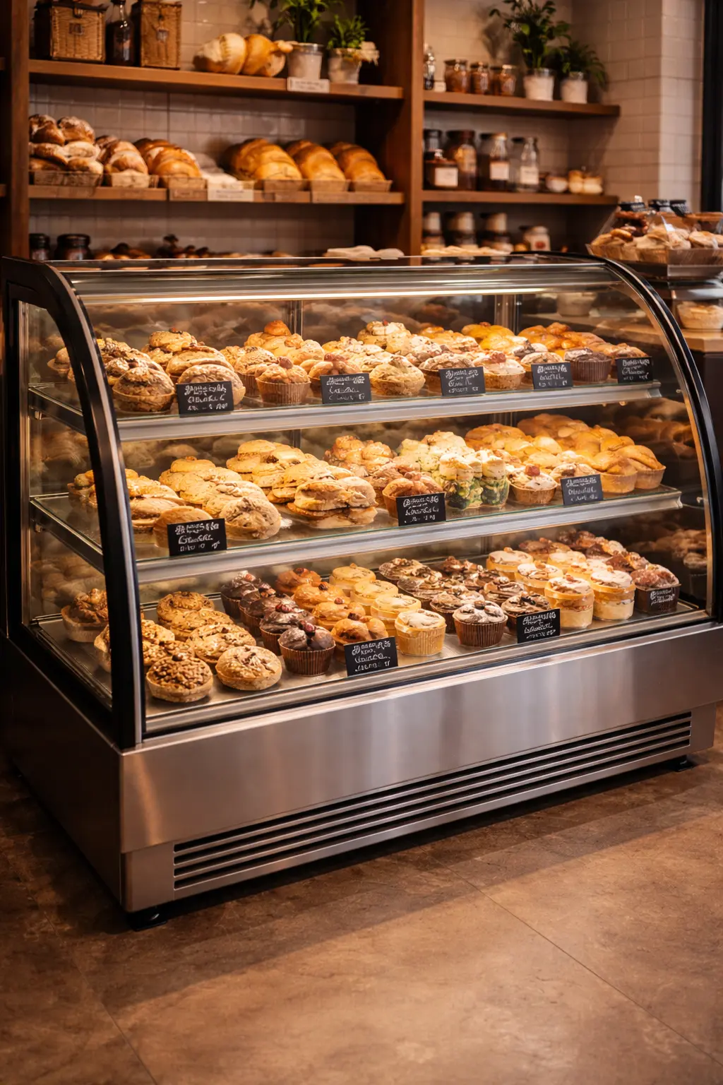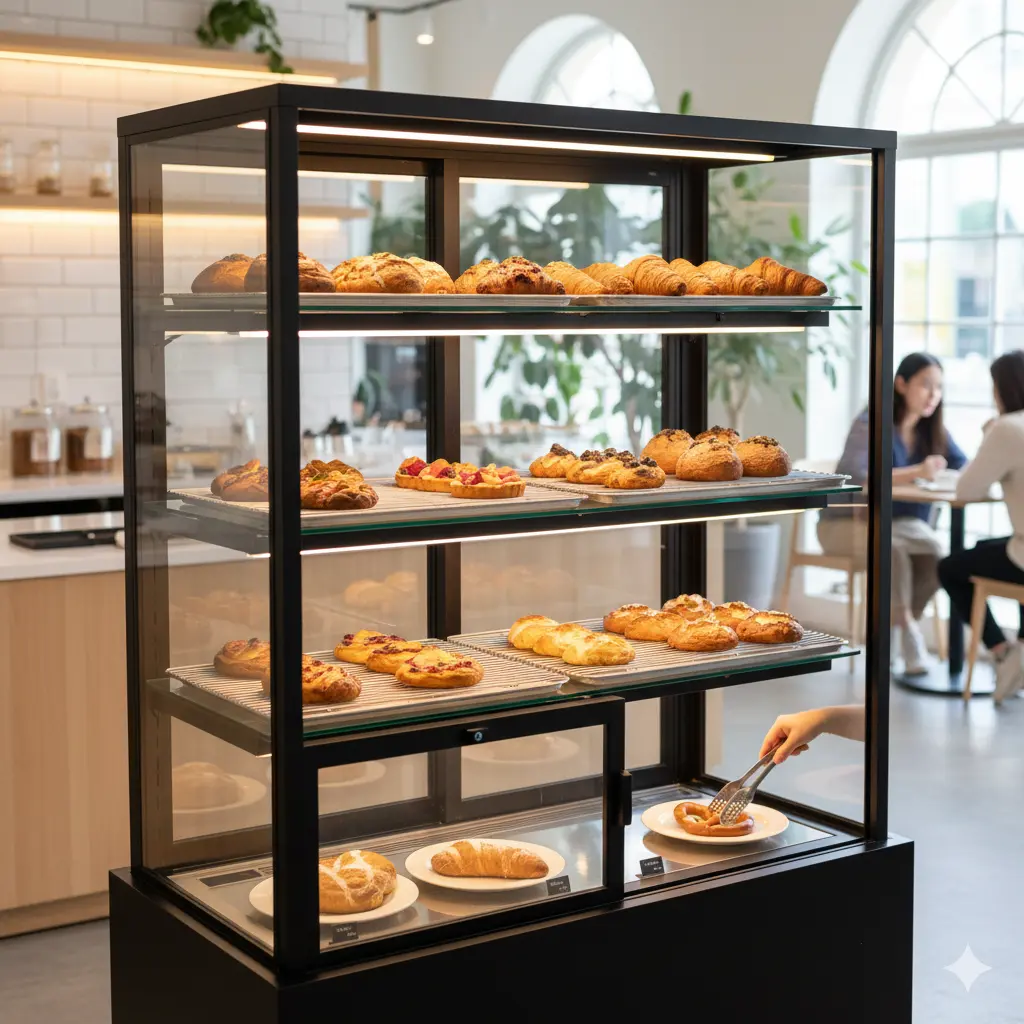 자동 센서형 베이커리쇼케이스: 최근 가장 주목받는 타입입니다. 고객이 다가가면 센서로 문이 자동으로 열립니다. 위생, 냉기 보존, 고급스러운 고객 경험이라는 세 마리 토끼를 다 잡을 수 있어 프리미엄 베이커리에서 선호합니다.