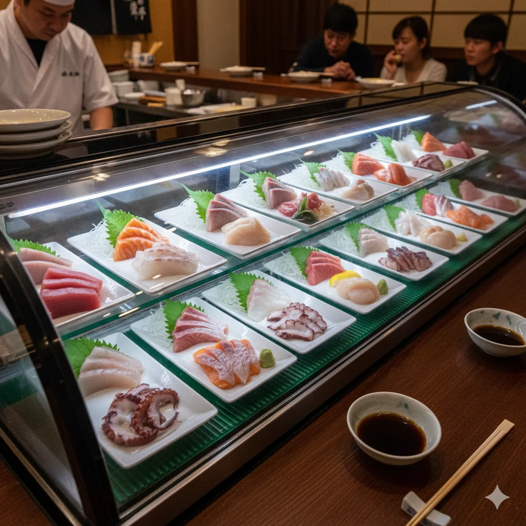 깨끗한 유리 너머로 보이는 선홍빛 횟감은 그 자체로 강력한 마케팅 효과를 발휘합니다.