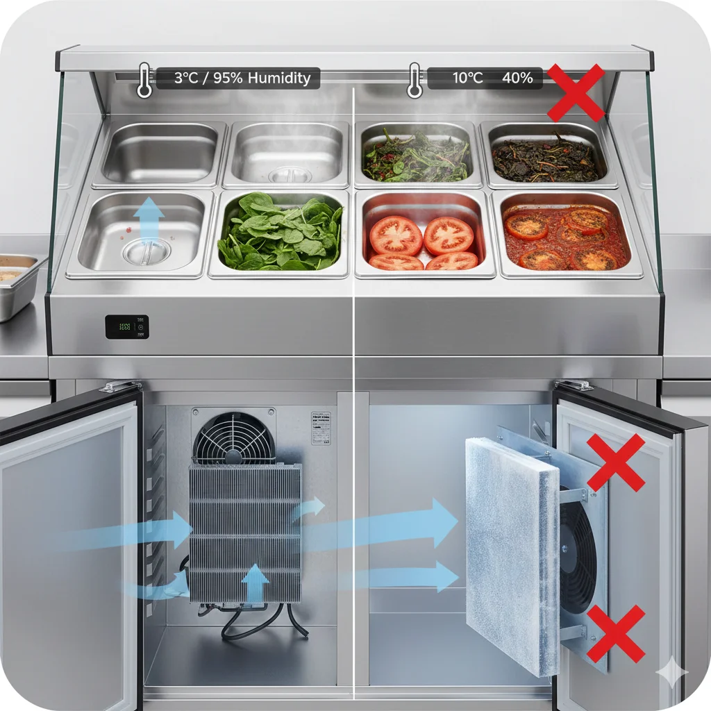 질문 3. 예민한 어린잎 채소나 소스가 묻은 재료의 변질을 막기 위해 샌드위치냉장고 의 '정밀 습도 제어'와 간접 냉각 방식이 왜 중요한가요?