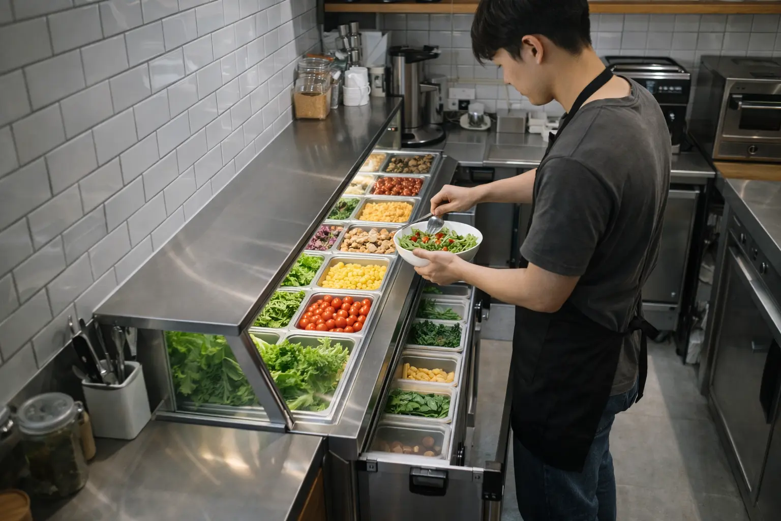 유통 단계에서 이미 만들어진 제품을 떼다 파는 대리점과는 차원이 다른 유연함을 경험할 수 있는 거죠. 공간을 200% 활용하는 똑똑한 샐러드냉장고 구성이야말로 작은 가게가 대형 프랜차이즈와 싸워 이길 수 있는 전략적인 무기가 된답니다.