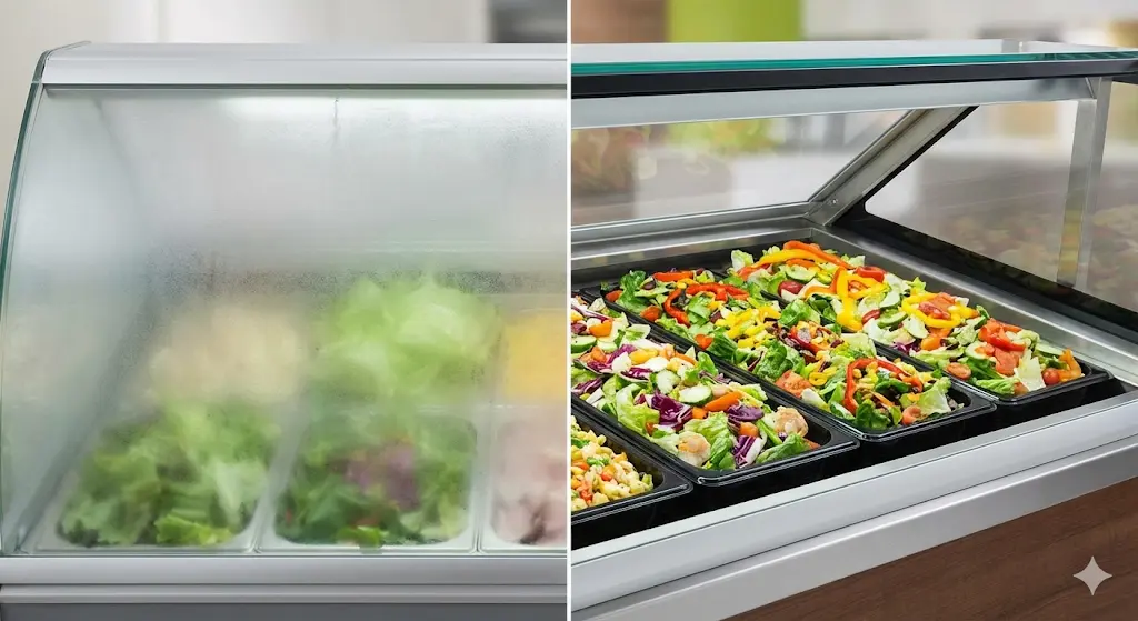 비 오는 날이나 습도가 높은 여름철, 샐러드 냉장고 유리에 뿌옇게 김이 서리는 현상을 보신 적이 있나요? 이는 고객에게 비위생적인 느낌을 줄 뿐만 아니라 제품 확인을 방해하여 구매 의욕을 떨어뜨립니다.