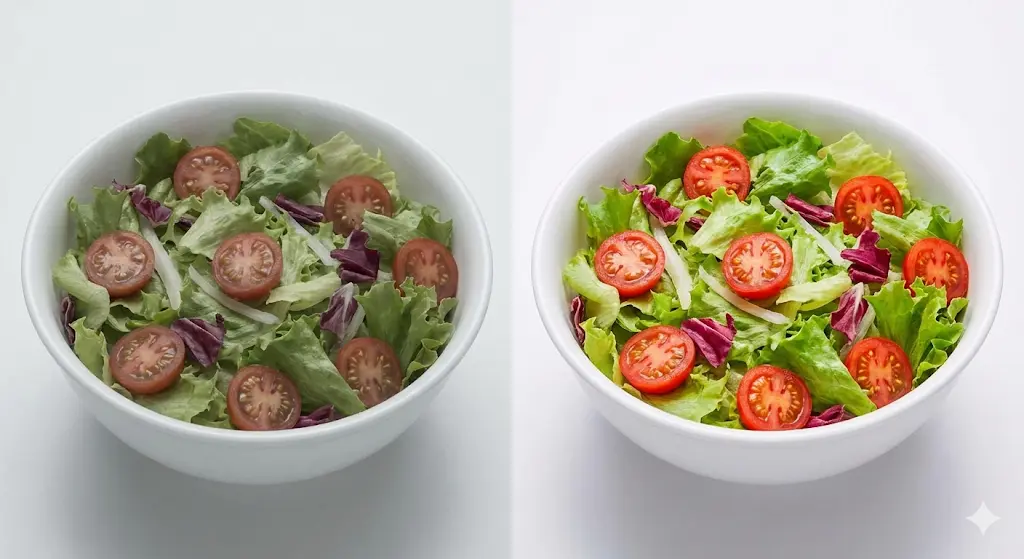 좌측에서 우측으로: 인간의 시선은 본능적으로 왼쪽에서 오른쪽으로 이동합니다. 왼쪽 끝에는 화려한 색감의 과일 샐러드를, 오른쪽으로 갈수록 묵직한 토핑이 올라간 식사 대용 샐러드를 배치하면 자연스러운 시선 유도가 가능합니다.