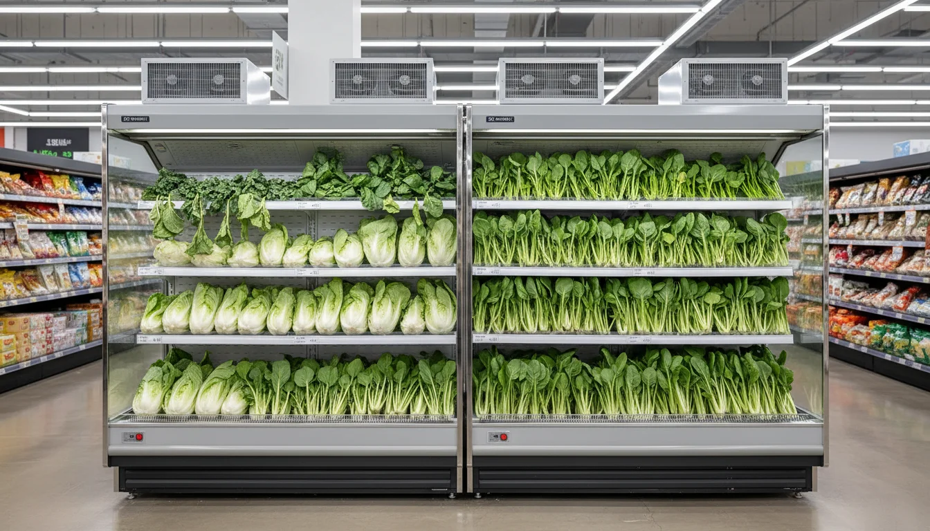 Q1. 오픈형 야채 냉장고, B사 제품은 3시간만 지나도 잎채소가 축 늘어지는데 한성쇼케이스는 왜 하루 종일 쌩쌩한가요?