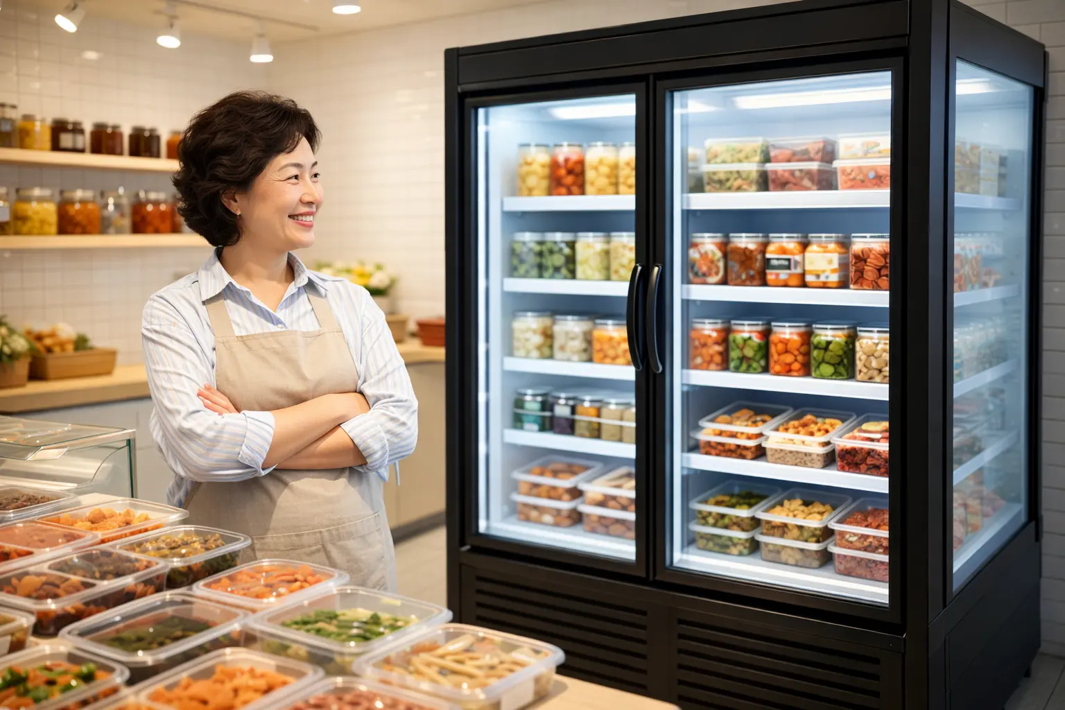 • 주방: 도어형 쇼케이스는 일반 냉장고와 맞먹는 단열 성능을 갖추고 있어, 신선도를 완벽하게 유지하면서도 상품을 가장 매력적으로 보여줍니다.