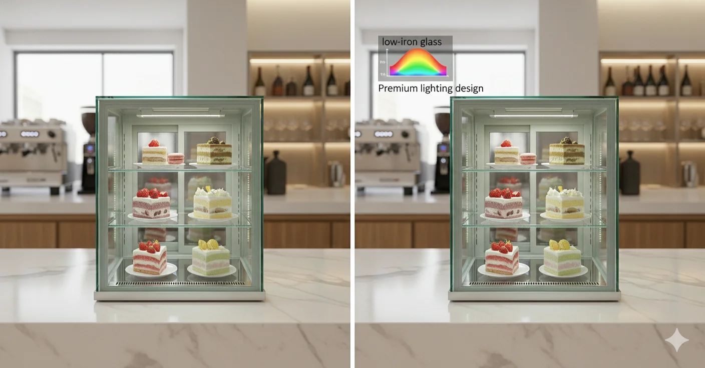 일반 유리는 특유의 푸른빛이 돌아 디저트 본연의 색감을 왜곡할 수 있으므로, 불순물을 제거하여 맑은 시야를 선사하는 '저철분 강화유리'가 적용되었는지 반드시 확인하셔야 합니다.