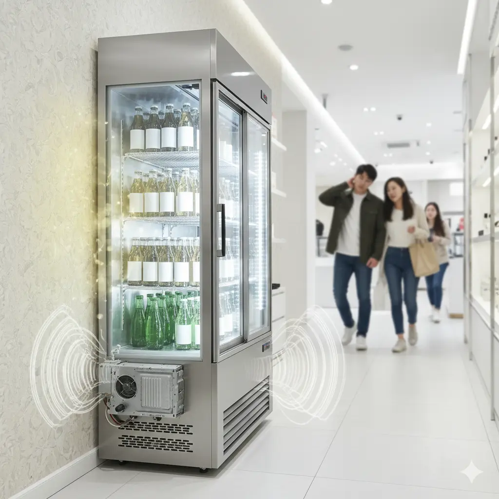 Q2. "매장이 좁아서 쇼케이스를 벽에 붙여 제작했는데, 주변 벽지가 뜨겁고 기계 돌아가는 소리가 너무 커서 손님들이 불편해합니다."